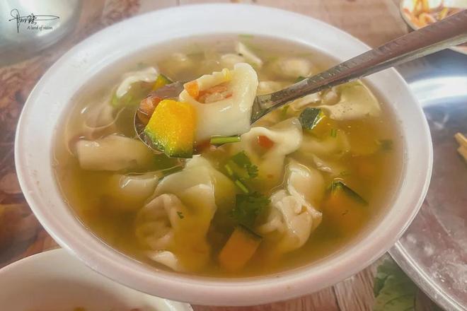 恰逢用餐时分,眼见路边排列着多家餐馆,于是便驶近了,事先并未通过网络了解各店的评价,我挑选这家仅因门口的大棚下恰好可停放我的摩托车。店主十分友好,见到新顾客便高声询问想点什么,而我对这里的美食一无所知,于是急忙询问。接着,两位热心的食客开始热情推荐:“这儿的牛肉包价格实惠,味道也相当美味,只需一元就能买到一个……”,而此时,老板却被无情地晾在了一旁。由于店内也提供烤包子,我便也点了一份,选了两个牛肉包和一碗馄饨。原本我打算要一碗羊肉汤,然而可能是因为价格较为低廉,老板似乎并未留意(嘿,拍照时我半开玩笑地指向那大锅羊肉汤,抱怨了几句,没想到他竟然主动从汤里捞出一段骨头递给我,这难道是所谓的“封口费”?)我喝了一口,似乎还尝到了骨髓的味道,口感相当不错,而且还有视频可以作证呢。