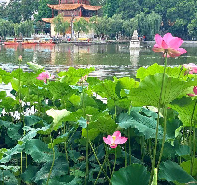 目前,昆明市的著名景点大观公园正值荷花盛开之际,吸引了大批游客前来欣赏,其中不乏来自外地的游客。