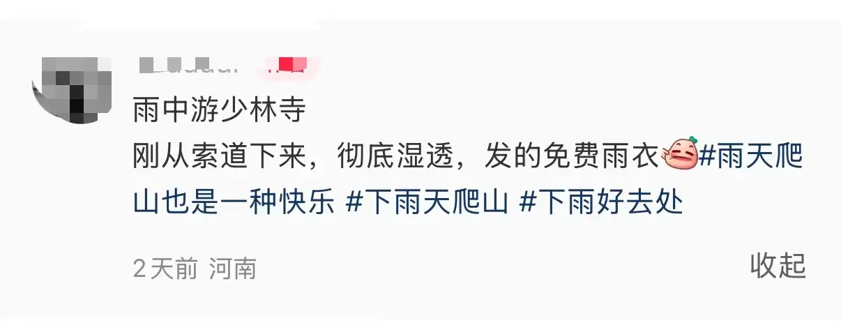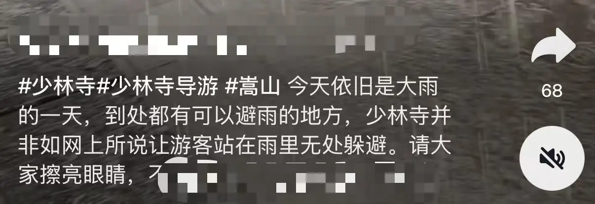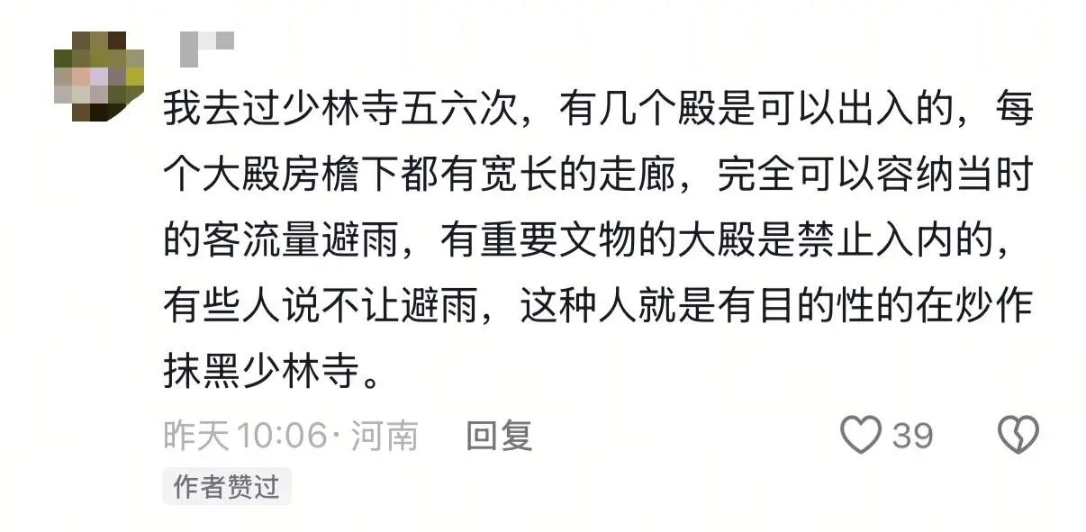 李明在视频平台上分享了避雨的经历,众多游客纷纷效仿,记录并分享了他们当天避雨的经过:少林寺的工作人员不仅发放了雨衣,还指引游客前往香火旺盛的地点、走廊等避雨场所;我多次游览少林寺,发现每个殿堂的屋檐下都设有宽敞的走廊,足以容纳当时众多的游客避雨;那些存放重要文物的大殿暂时关闭,我们对这一举措表示理解和支持……
