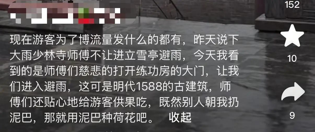 阿宝发现一位博主抱怨少林寺无法提供避雨之处,于是她迅速将一段避雨的视频上传到了短视频平台。她表示:“在房檐下、走廊上,明明有许多地方可以避雨。然而,少林寺却只是默默地进行善举,助人为乐。正如歌词中所唱:别人向我投掷泥巴,那我便用这些泥巴培育出荷花。”