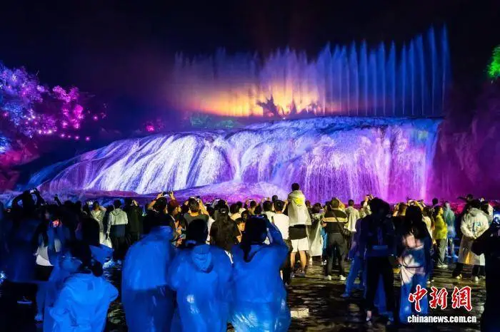 7月28日晚上,一些旅客前往贵州黄果树景区陡坡塘瀑布处,观赏了名为《再回西游》的大型实景仙幻演出。(黄果树景区供图)