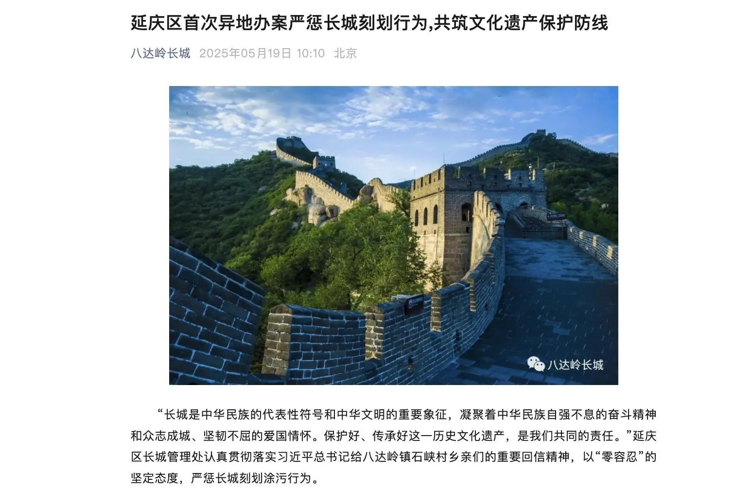 延庆区长城管理部门郑重号召所有参观者,在参观长城期间,务必自觉遵守相关文物爱护准则,实践文明观光精神,坚决抵制一切损害长城的行动。让我们齐心协力,共同建立文化遗产守护屏障,为继承和发扬中华民族优秀传统做出努力。