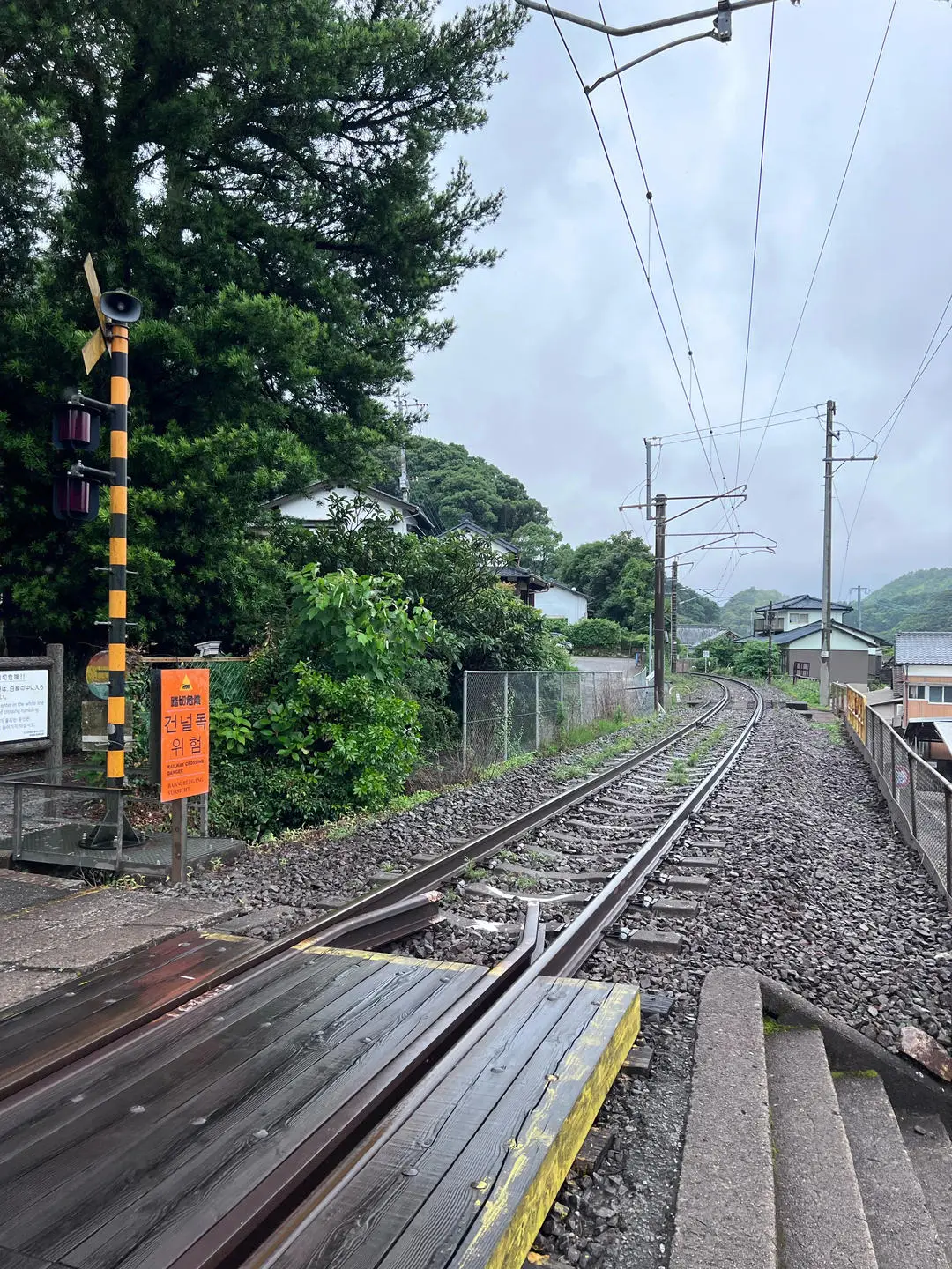周先生拍摄的影像资料表明,铁路入口处设有木质结构,其中一边是平坦区域,另一边则是阶梯状通道,没有安装护栏,不过可以看到一根直立的杆子,上面装有警示灯和喇叭等设备,此外还有一块标示牌,用多种文字注明了“危险”的字样。
