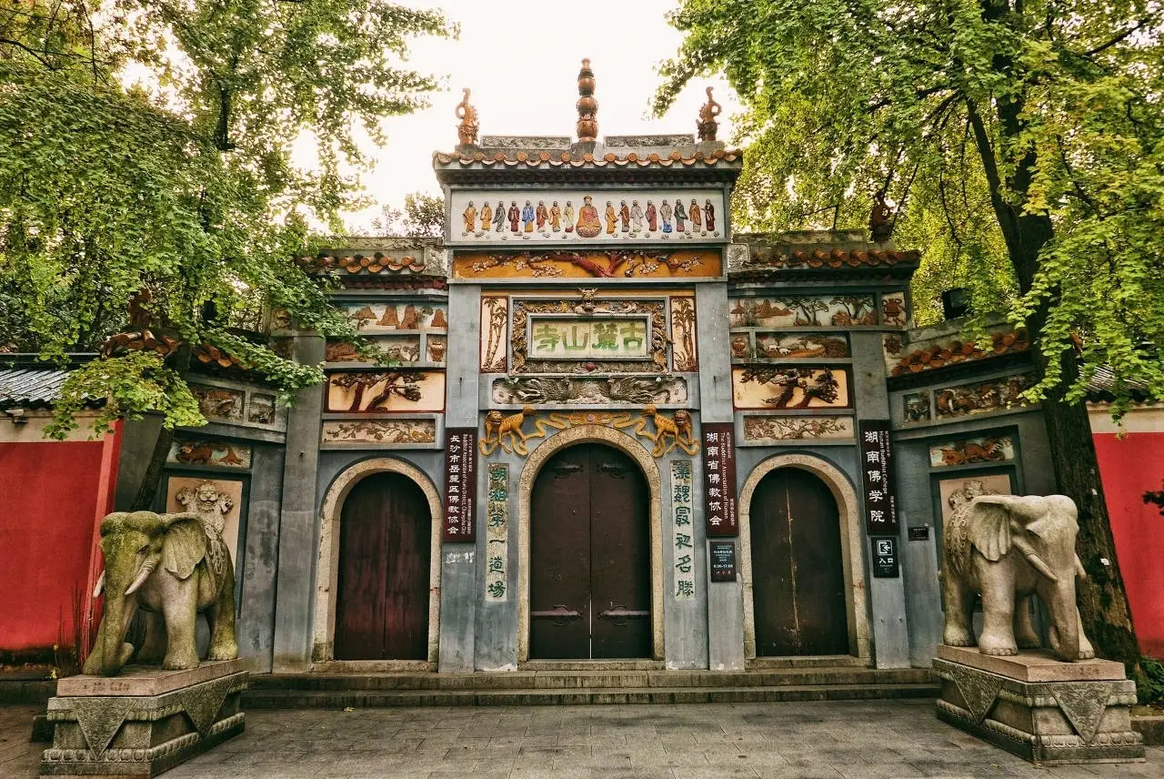 麓山寺,也叫岳麓寺、慧光寺、鹿苑、万寿寺,地处湖南省长沙市湘江西岸的岳麓山碧虚山中。唐代大诗人杜甫曾用诗句“寺门高开洞庭野,殿脚插入赤沙湖”来称赞殿宇宏大。大雄宝殿等主要建筑,在1944年被炸毁,仅留下山门和观音阁,如今已修整得焕然一新。山门上有一块写着“古麓出寺”的横额,在横额两旁是一副写着“汉魏最初名胜,湖湘第一道场”的对联,寺院门外古老的枫树高耸入云,浓密的树荫覆盖着地面,门内的园圃充满绿意 。