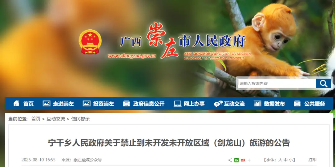 8月9日,广西崇左市天等县宁干乡的政府机构公布了一份声明,内容是禁止前往尚未开发也未对外开放的区域,也就是剑龙山,进行游览活动。