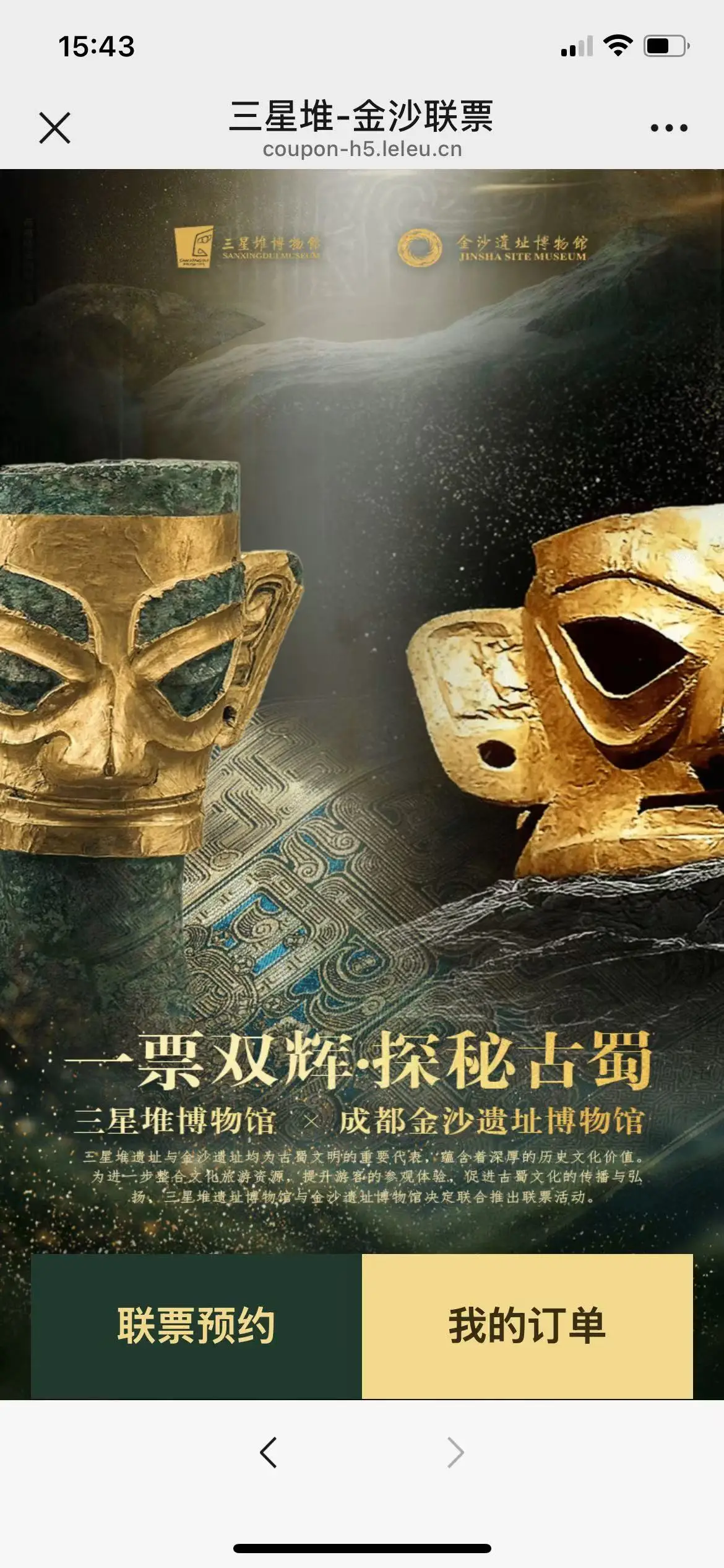 8月15号开始,到10月15号结束,三星堆博物馆和成都金沙遗址博物馆联合搞活动,卖一种联票,叫“一票双辉·探秘古蜀”。这种票已经可以提前订了,卖给所有不是学生也不是小孩的人,不管是中国人还是外国人,但是不卖给有折扣票或者免费票的人。