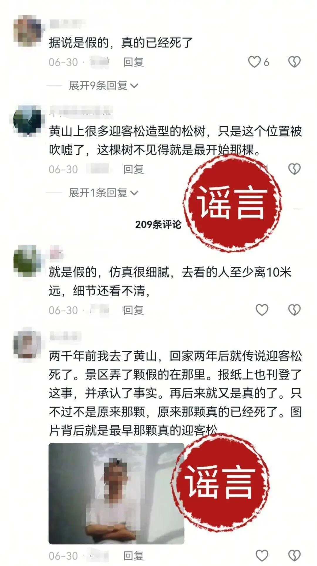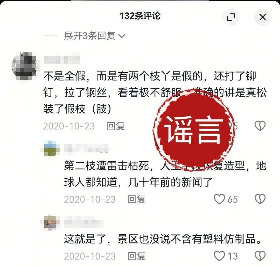 “黄山迎客松枯死了!树枝是假的!”