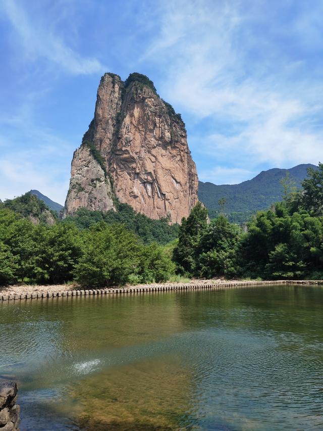 石桅岩景区面积不大,主要景观是一块像船桅又似风帆的巨大岩石,周围溪水环绕,绿意盎然,非常适合拍照留念。我们还乘坐了大约五分钟的游船,这样就不必费劲地爬山,而且从船上欣赏风景的角度也非常好。