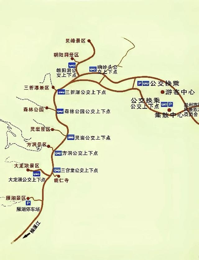 从酒店出发,四个景点按距离远近排序依次是大龙湫、方洞、灵岩、灵峰,按这个顺序理论上可以游览。我们在网上了解到,从灵岩去方洞是上坡路,途中有很多台阶需要攀登,反过来走主要是下坡路,会轻松很多。因此我们决定先游览大龙湫,然后从灵岩乘坐景区巴士前往方洞,游览完所有景点后从灵岩离开,最后自己开车去灵峰。实践证明,这样的行程安排非常合理。