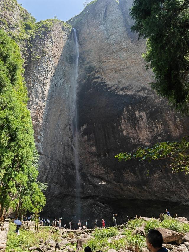 当天的最高温度仍然达到38度,大龙湫景区已经能望见一些相当宏伟的山峦,景区中最吸引人的地方是一处总落差达到197米的流水。虽然名为瀑布,但实际水流并不丰沛。然而,在汗流浃背的时节,行至瀑布下方的池边,会立刻感受到扑面而来的凉意。同时,仰头眺望从高空垂落的景象,也能有效缓解长期伏案工作导致的颈部不适。孩子们最为高兴,他们在潭边嬉水,用玩具枪互相射击,也在巨大的石头上攀爬跳跃,而成年人则忙着记录这些瞬间,拍摄照片留念。