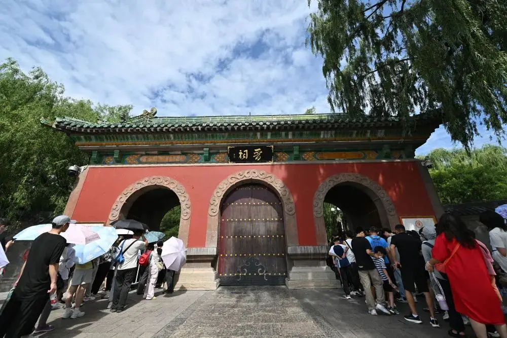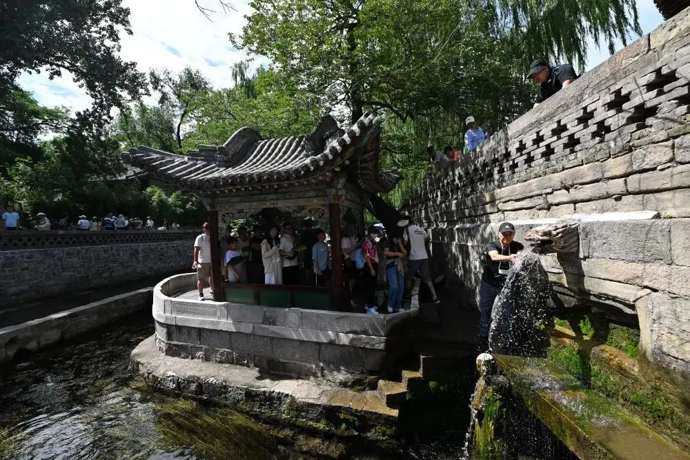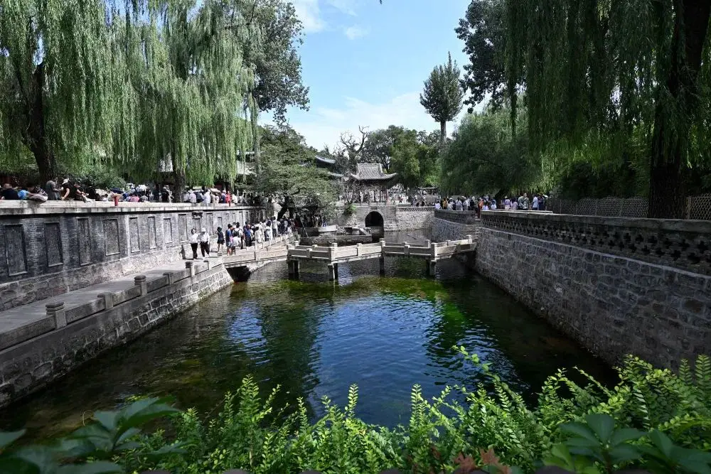 2025年8月7日,许多人聚集在晋祠难老泉处,等候欣赏泉水,新华社记者詹彦拍摄了当时的场景。