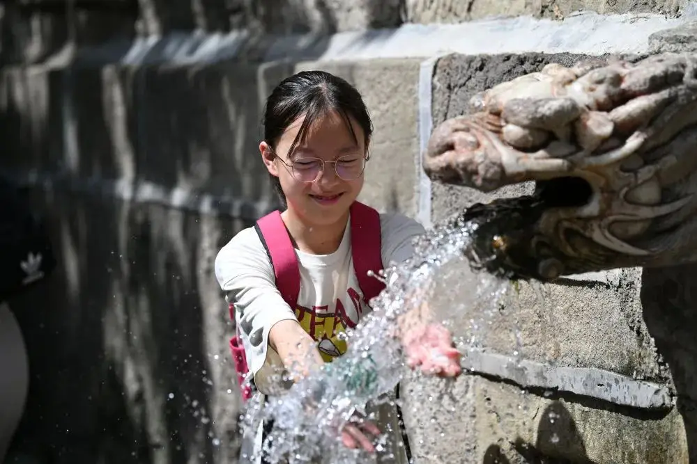 二零二五年八月七日,有位参观者在晋祠难老泉体验泉水甘甜,新华社记者詹彦拍摄。