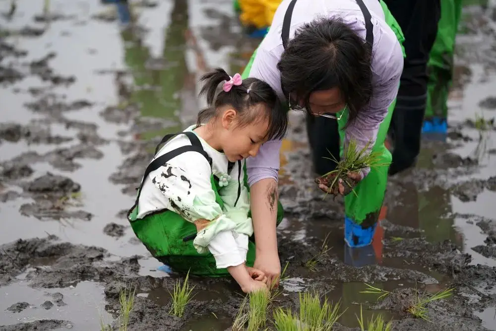 二零二四年五月四日,太原市晋源区晋祠镇北大寺村那片稻田中,有孩童与家长期待着体验插秧的乐趣。此情此景,由新华社记者詹彦镜头捕捉记录。