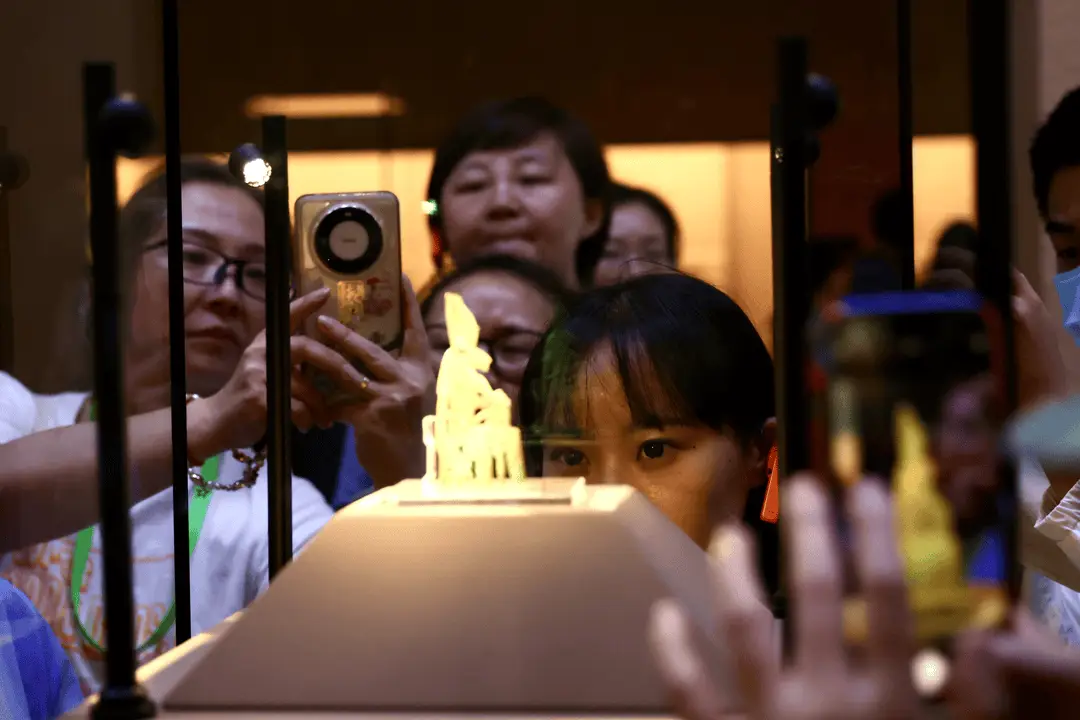 8月17日深夜,展览接待了最终一批访客。23点整,孔先生进入展馆,馆内负责人特地出来迎接并赠送了礼物,让他倍感意外和欣喜。他早就计划来上海博物馆参观展览,只是白天工作繁忙抽不出时间,于是特意抢了当晚的入场券。尽管孔先生能参观的时间非常有限,但他依然觉得十分满足。毕竟这是展览的最后一日,之后再无类似的机会,能看多少便看多少。