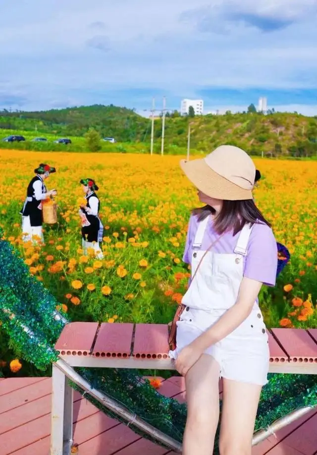 雨露乡的万寿菊种植区是南华的知名景点,花田规模浩大,景象十分宏伟,和晴朗的天空、起伏的山峦,以及纷纷赶来的游客合影者,共同形成了初秋时分最动人的景象。