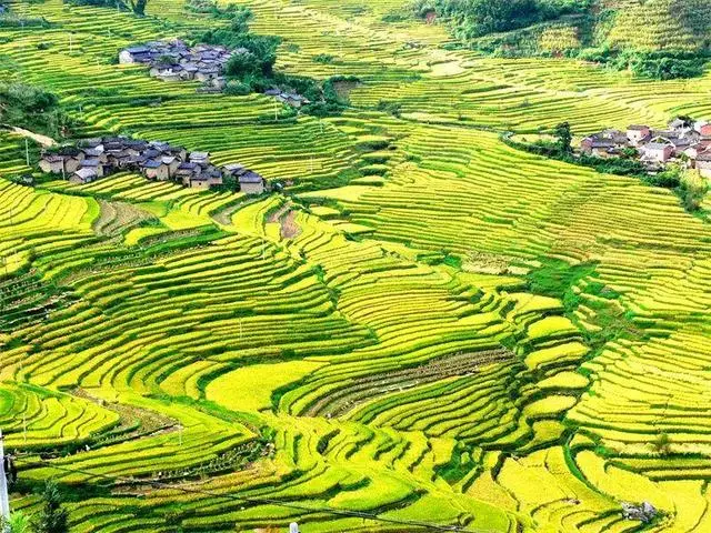 田野里,错落有致的鄂嘉梯田一片灿烂,宛若调色板铺展在地面,以动人的姿态映衬着民居、碧水和山峦,仿佛天然形成的水彩图,极为赏心,让人陶醉。