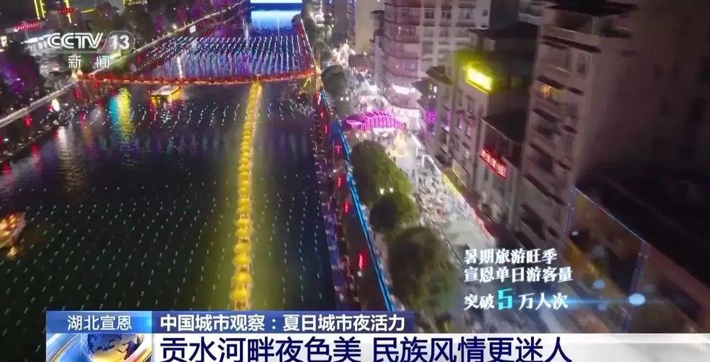 贡水河岸边,光彩夺目,竹筏似蛟龙穿梭,土家族墨达楼和成片灯光相互映衬。多项文化盛事热烈开展,为湖北宣恩县城增添年轻气息。