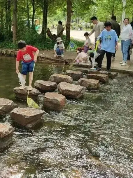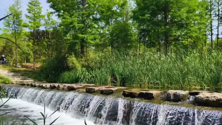 洛浦公园那边人声鼎沸,而伊水游园则格外清静。园内溪水澄澈,草木葱茏,小径曲折。