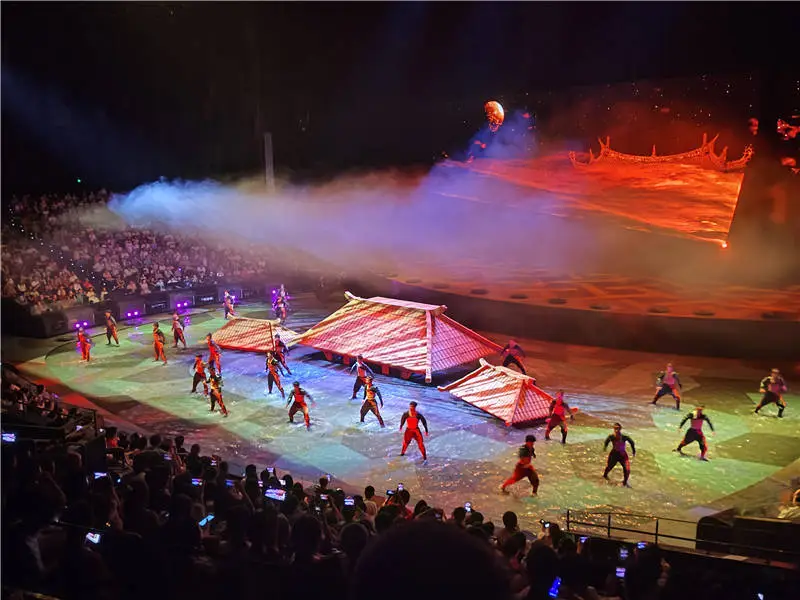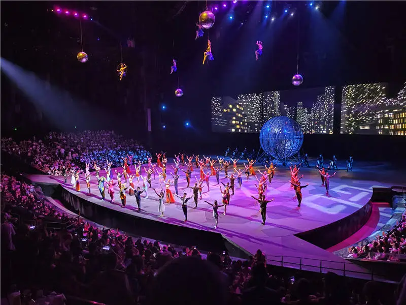 表演通过惊险动作和科技手段创造难忘印象:在24米高空,金菊奖高空团队表演精准的抛接,白色粉末随表演飘散;在“12飞十字球”的铁笼中,摩托车手完成90度垂直下坠并360度旋转,车轮间距极小;从27.5米高的台子跳下,表演者以每小时80公里的速度撞击水面,承受十倍体重的巨大力量。高空绳索的曼妙舞动,穿插着小丑的诙谐表演,观众心情起伏,最终以雷鸣般的掌声掀起“沸腾海洋”。