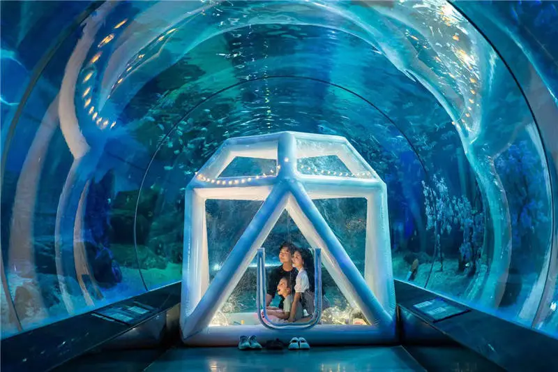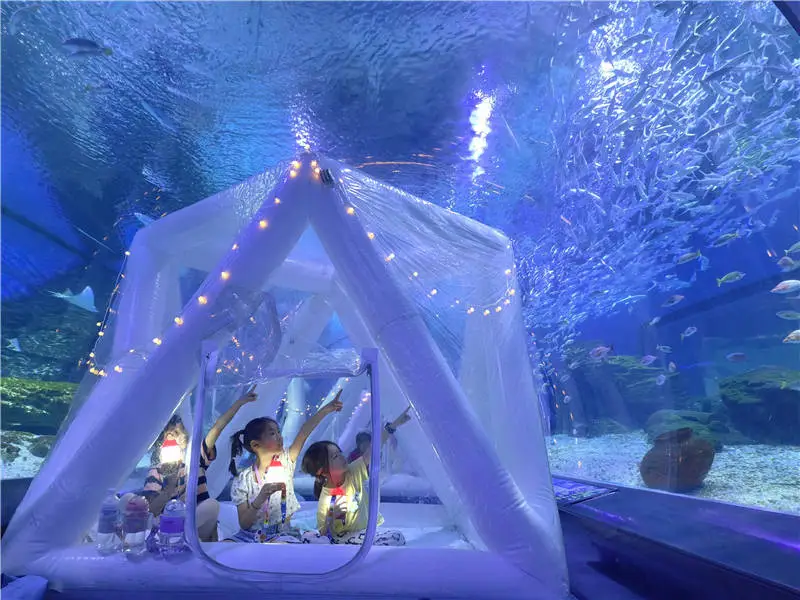 和成千上万种动物同处一室是怎样一番感受?在武汉极地海洋乐园,过夜海洋馆是今年夏天家长和孩子的首选活动。晚上九点多钟,熄灭灯火后的武汉极地变得十分安静,在深蓝色的“水下通道”旁边,孩子们支起白色的充气帐篷,挂上微弱的小灯泡,与在水中游动的鱼类、可爱的白鲸一同安睡。孩子们发现某些海洋生物不再移动,而是静止地停留在水中,指导者小声说明,这种现象其实是在休息。