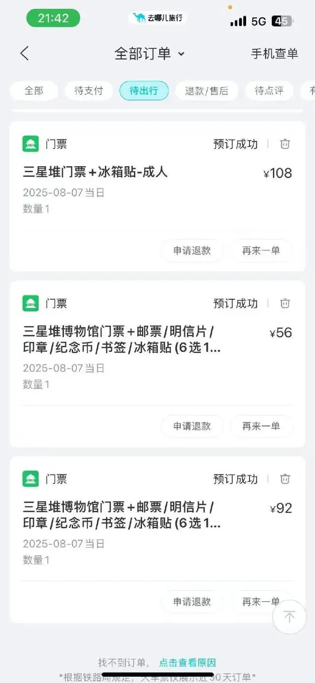 最近,吴女士通过澎湃公众互动平台“服务派”反映情况,说她于今年7月底在去哪儿网买到了三星堆博物馆的三张门票,打算和家里人8月7日去参观。可等到她订好车票和酒店,准备出发的时候,却发觉这三张门票不在同一个场次,而且其中一张根本没买成功。