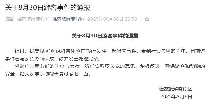 最近,在咱们度假区的“萌虎科普体验官”项目上,有位游客出了点状况,这件事引起了大家的注意,现在已经跟那位游客的家人谈妥了,事情得到了圆满解决。谢谢各位朋友的关心和帮助,我们会认真考虑大家的看法,努力做得更好,保证游客和动物都能安全,然后向大家展现动物们纯真可爱的样子。
