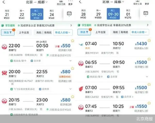 北京商报于9月7日通过携程旅行软件发现,中秋与国庆节假日期间,北京前往成都、北京前往乌鲁木齐等热门航空路线的票面价格出现显著上调。以北京至成都航线为例,在同为周二月份的9月23日和9月30日之间,该航线由川航运营的回程班机基础票价为550元。国航、海航、川航及南航所提供的航班,其价格层级位列第二档,均为580元。一个月后的9月30日,该航线的返程机票基础价格已攀升至1430元。提及的川航尚有经济舱享受九五折待遇,不过售价由550元飙升至2800元,增幅逾四倍。