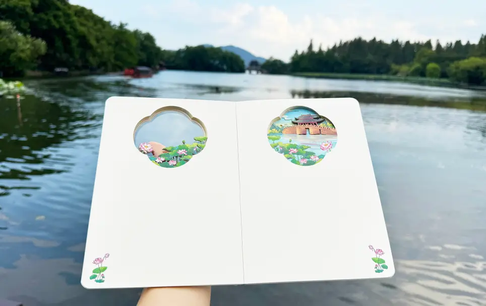 每一页都有一幅独特的画面,将湖光山色「描绘」在笔记本上,挑选了三潭印月、雷峰塔、曲院风荷、花港观鱼、梅鹤轩这七个著名地点,借助纸张作为载体,利用光线当作画笔,生动地展现出来。