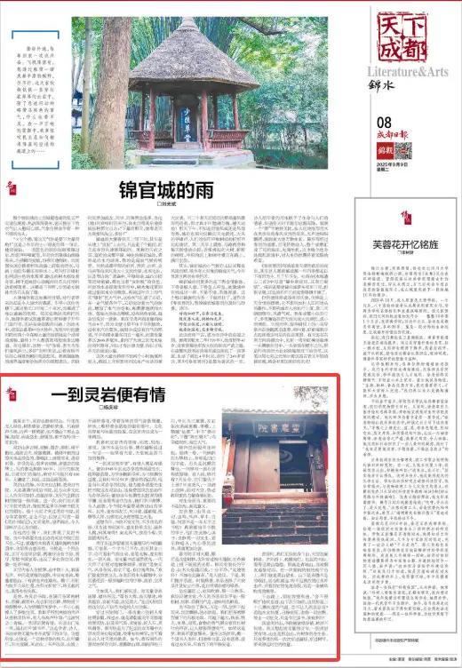 确实,于灵岩书院,于层峦叠翠的林木、蔓延的苔藓、茂盛的蕨类间,于陈旧的石碑、牌坊投下的幽暗里,人宛若徜徉于幻境,稍不留神便陷进了异次元之境。仿佛听见清脆的欢笑声自密林深处传来,有人高声吟哦道:“远行无需登青城,初抵灵岩已生情。未入山径先含笑,遍山红叶伴书声。”此乃学者、诗人、书法家谢无量先生在此所题的诗句。意境所描绘的,应当是一幅色彩斑斓的秋日图景,赤叶夺目,暖阳和煦,灵岩山间传来阵阵读书声,山坳处遍植野菊,散发出微涩的芬芳,四处弥漫,林地上铺满金黄色的银杏叶,如同碎金般堆积。诗篇中,历史的深沉与秋日的飘逸,融合成相互映衬的两种风貌。