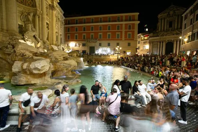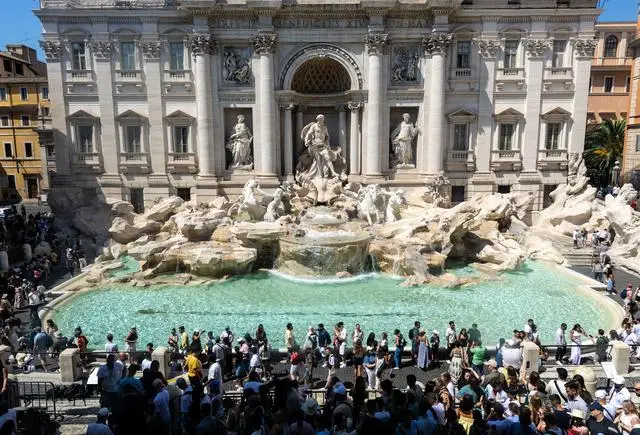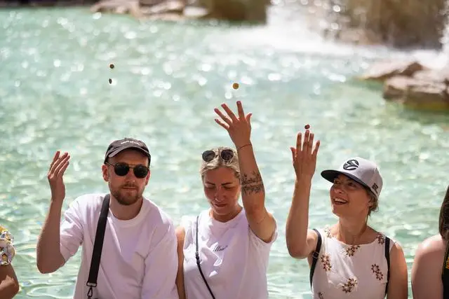 人们在意大利罗马的特莱维喷泉扔硬币许愿