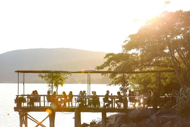 人们在意大利的布拉恰诺湖畔吃晚餐