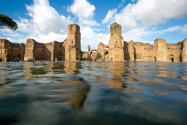 意大利罗马的 卡拉卡拉浴场和一处名为“镜子”的水池(前)