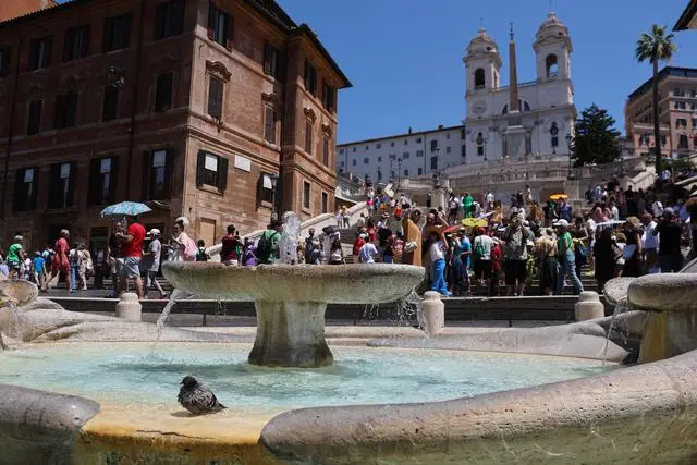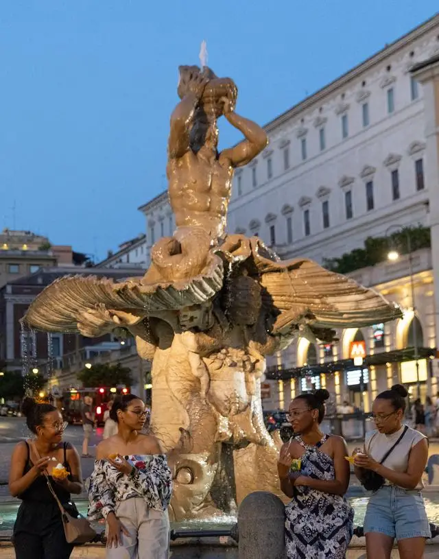 游客在意大利罗马的特里同喷泉吃 冰淇淋