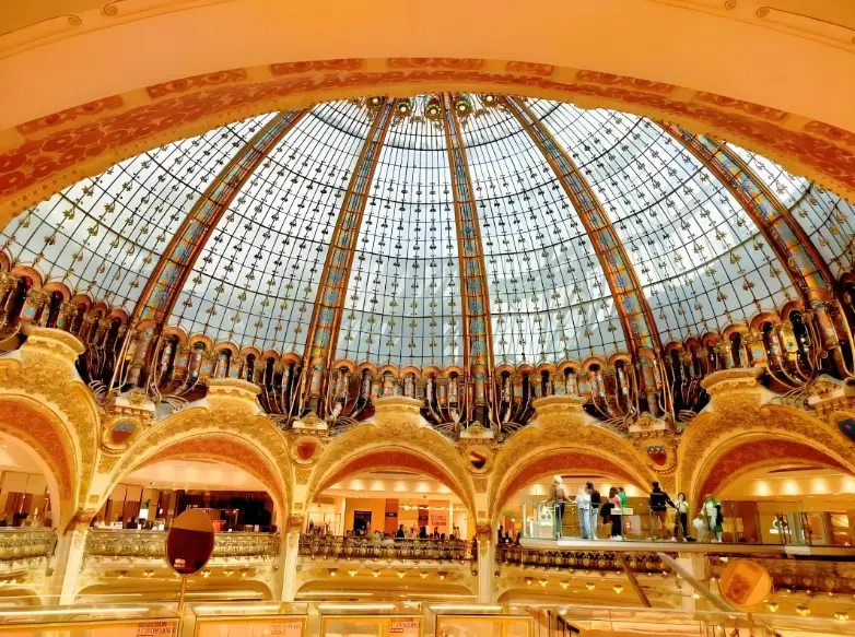 巴黎市区里,大型零售店铺众多,其中老佛爷最为出众。它坐落于奥斯曼大道,顶部装饰着金色构件,透明覆盖物宛如一座水晶楼阁,映照出都市的喧嚣景象。