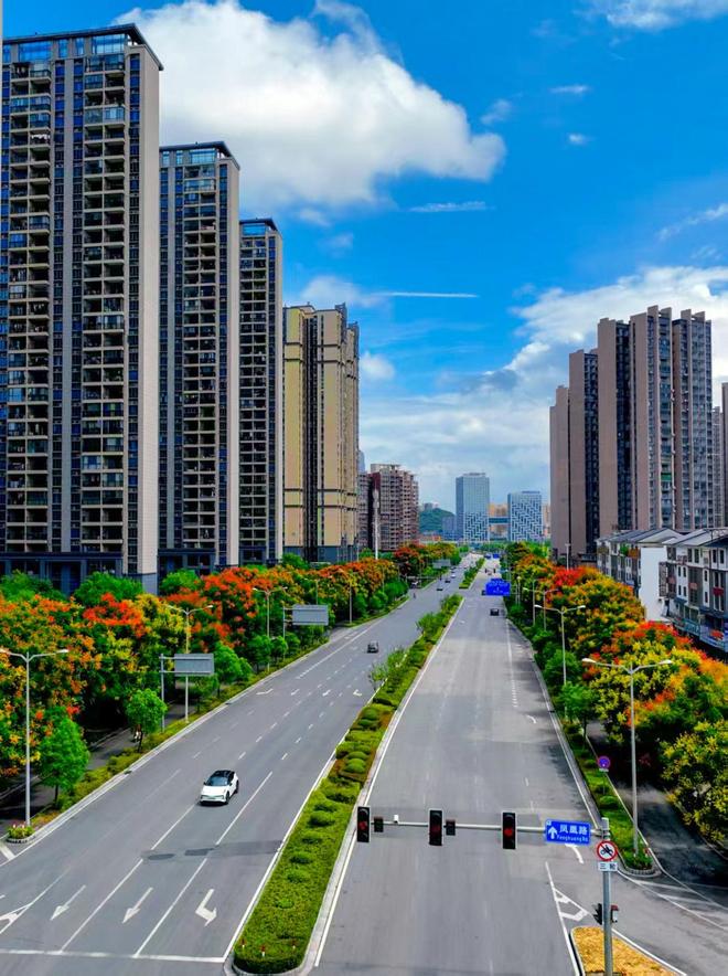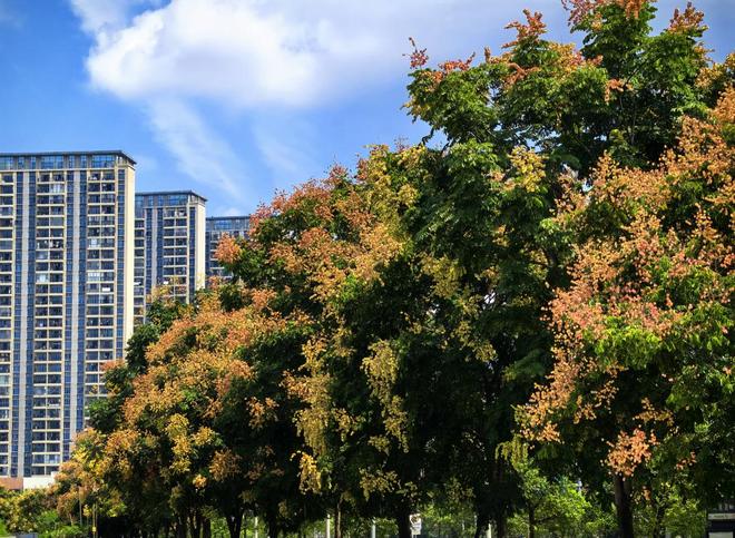 近期驾车途经桂林临桂区凤凰路,钟女士总会不自觉地降低行驶速度,希望借此机会更好地体会此处秋季独有的绚烂风情。她被路旁的栾树深深吸引,只见湛蓝的天空中,树木呈现出绿、黄、红交织的景象,如同闯入了一幅色彩斑斓的画卷之中。