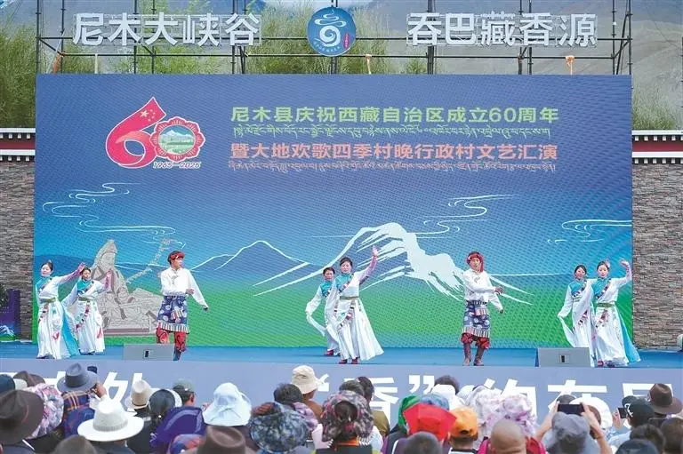 藏香文化旅游节期间举办的大地欢歌活动,在四季村晚行政村举行文艺汇演。鹿丽娟记者拍摄。