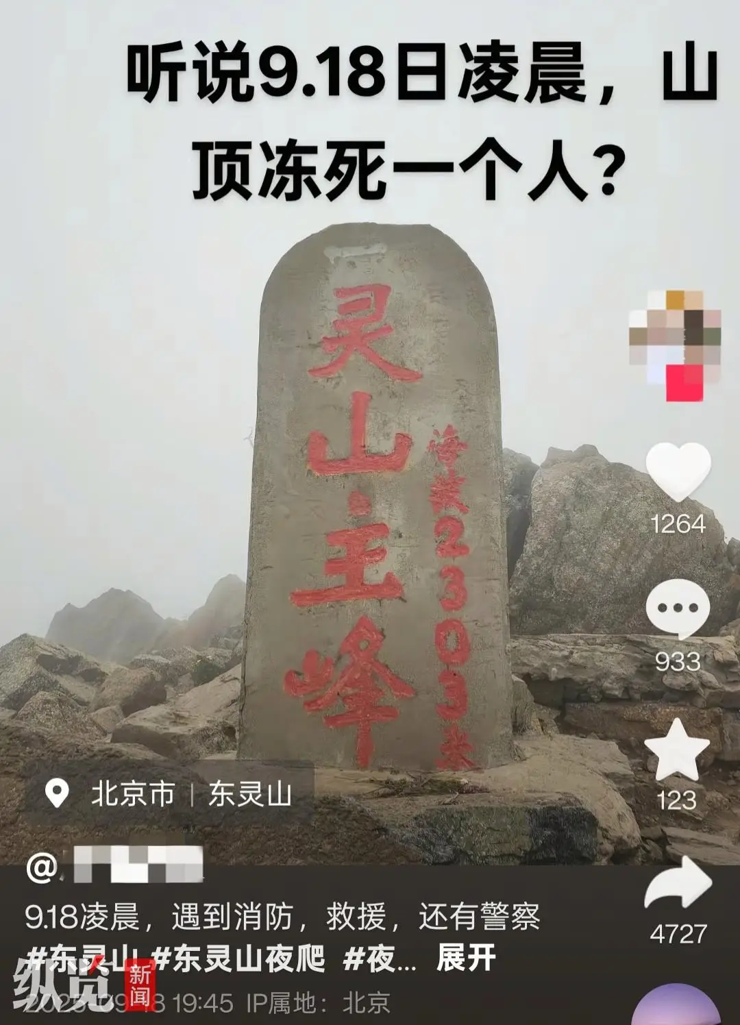 网传有人夜爬东灵山时被冻死。(来源/网络)