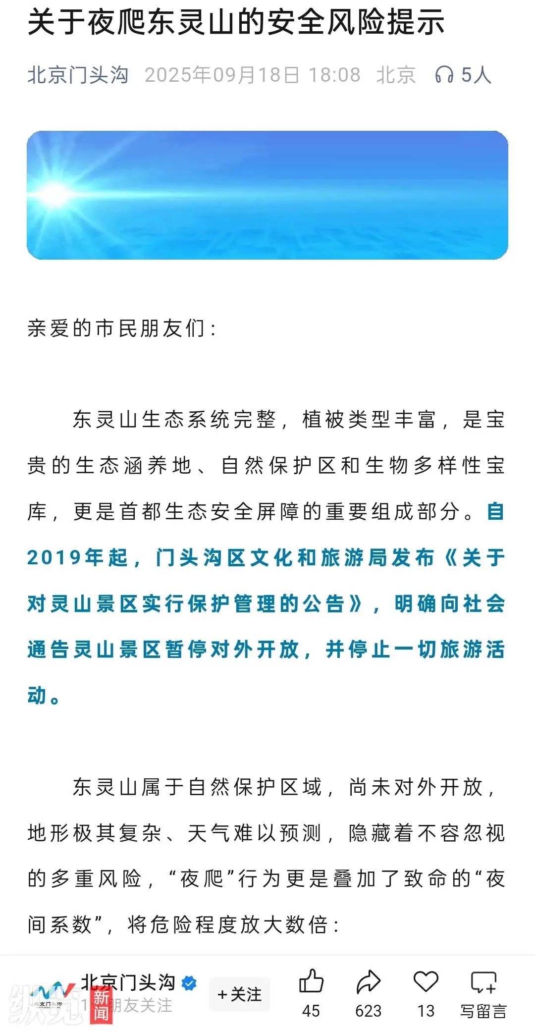 调查得知,9月17日,门头沟区清水镇相关机构与文旅部门等四家单位共同公布了一份禁止游客私自前往东灵山进行穿越、攀爬等行为的警示文件(该文件后文简称《警示》)。紧接着在9月18日,门头沟区清水镇相关机构与文旅部门又联合发布了一则关于夜闯东灵山存在危险性的风险说明。《提示》里说明,从2019年开始,门头沟区文化和旅游局公布了《有关对灵山景区执行保护管理的布告》,清楚地向公众宣布灵山景区暂时停止接纳游客,也终止了所有旅游项目。