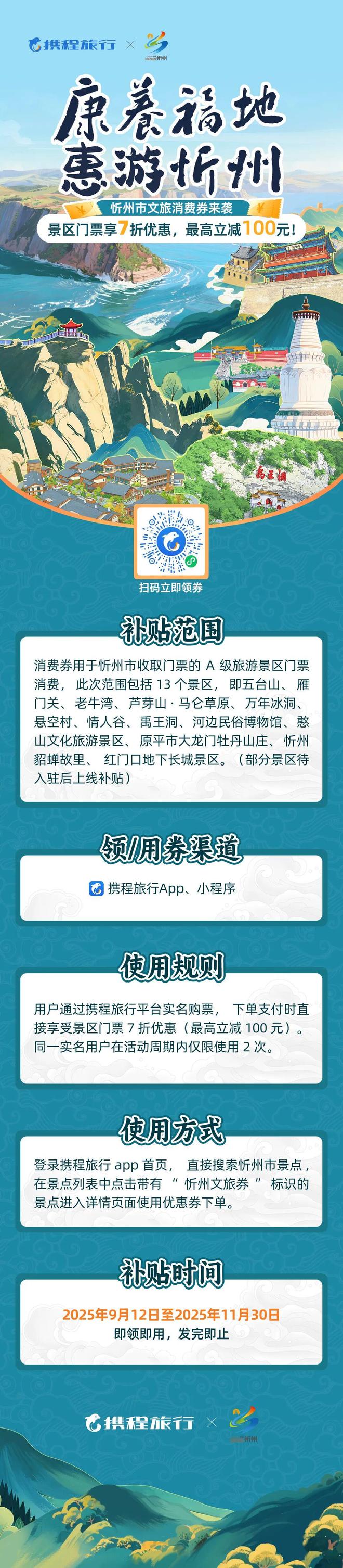 利用秋季适宜旅游的时节,前往山西忻州进行休闲活动。为了让游客充分感受美好的假期感受,"康养福地 惠游忻州"忻州市文旅消费券从2025年9月12日开始发放,涵盖境内13个A级景区的入场费,涵盖五台山、雁门关等著名地点,最多可减免100元,先领取先享受,请尽快行动来获取。