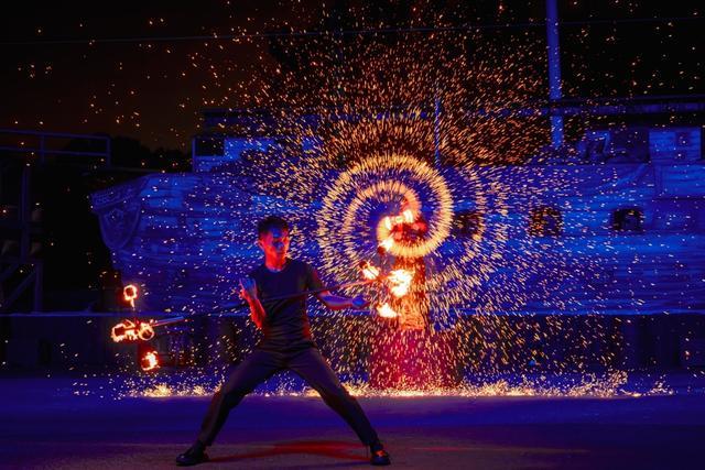 “火人庆典”期间,非遗火艺展演精彩纷呈,火刀、火棍、火壶、火流星接连呈现,演绎东方风情的火焰艺术;祭祀火焰与拜月典礼结合了威尼斯面具和传统傩面特色,兼具庄重氛围和视觉享受。另外,《篝火晚会》《摇滚之舞》《奇幻木偶》《火焰庆典》等演出,会在音乐场、幻境林、锅庄广场台、时空街等地点从黄昏至深夜不断进行,观众亦可体验非遗脸谱变换、星火乐章,在旋律与光焰里尽情展现能量。