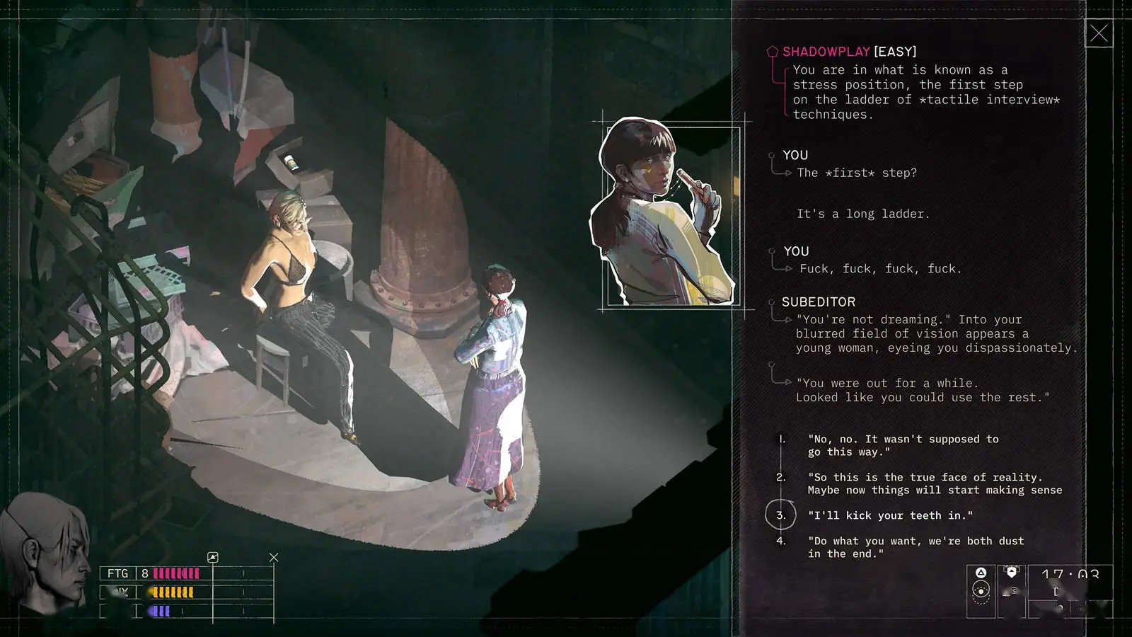 赫歇尔和传统角色扮演游戏不一样,他不能花很多天时间去理解概念,所有精神锻炼都必须在压力很大的情况下迅速进行,这种设计既和秘密行动的背景很搭,也加强了“职业会让特工心理变差”这个主要故事线索。