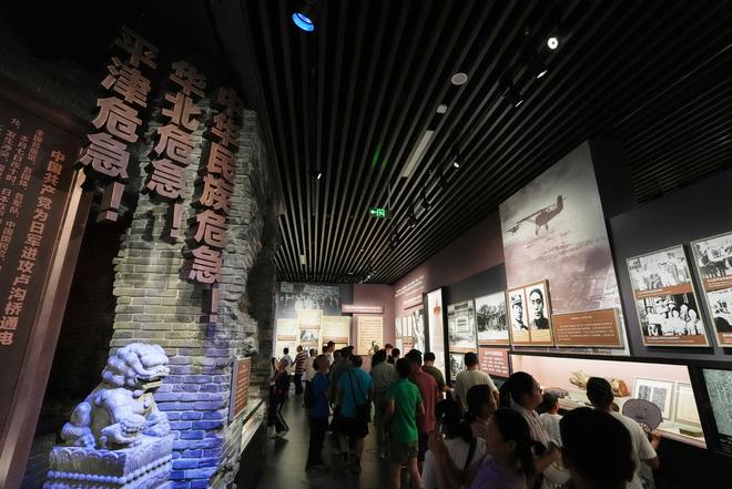 来宾在2025年7月8日于中国人民抗日战争纪念馆观赏《为了民族解放与世界和平》专题展板,此景由新华社记者鞠焕宗拍摄。
