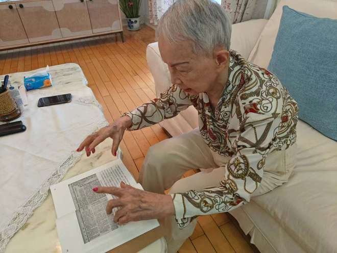 江国珍女士回忆起傅莱前往晋察冀边区参与抗战的事情,这是她于2025年8月23日接受采访时所说的,照片由新华社记者黄扬拍摄
