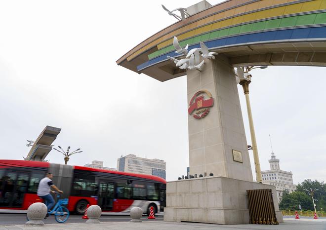 8月29日,车辆穿过了复兴门桥上的七彩拱门,以此作为装饰。北京市动用了多种手段,开展了一系列的装饰活动,来庆祝中国人民抗日战争与世界反法西斯战争取得胜利的八十周年。这幅照片由新华社记者谢晗拍摄。