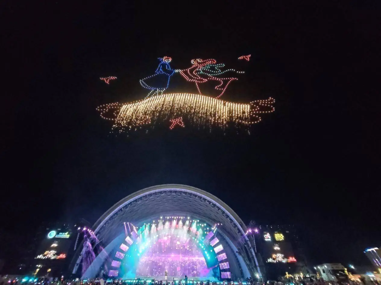 这里的歌曲还没听完,夜空忽然被无人机“占领”——将近千架无人机放飞,立刻“形成”了“鹊桥相会”“牛郎织女”的景象,彼此靠近,充满爱慕。“以前只在短视频上看到过,现场感受实在太令人惊叹了!”游客简婷不停地用手机拍照。