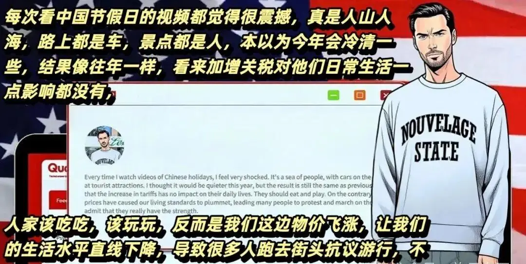美国网友表示,每逢中国假期出游的影像,总能让他们感到惊奇,场面十分壮观,到处都是行人,道路拥堵不堪,各个名胜之地都挤满了人。