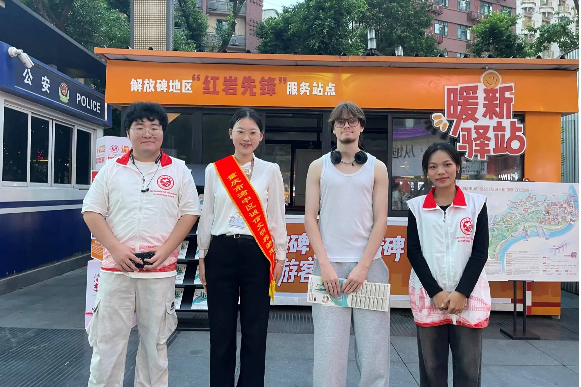 十月一日,设置于重庆市渝中区解放碑的“有口皆碑”旅游服务站,开始为国际游客提供接待服务;来自泰国等地的国际志愿者,在服务现场为德国、俄罗斯等外国游客提供信息,担当起引导的角色。根据说明,这是解放碑街道与区委社工部、区文旅委等机构合作建立的,重庆市首个面向国际的志愿服务站点。