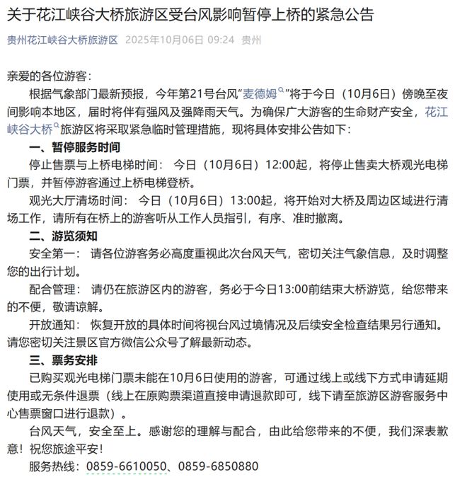 花江峡谷大桥旅游区官方微信发布紧急公告。图片来源/官微截图