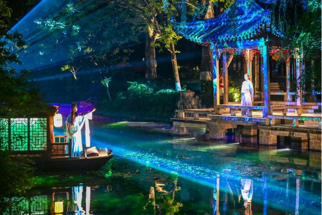 国庆、中秋联袂假期,济南趵突泉景区精心策划了名为《趵突夜画》的夜间游览活动,该活动巧妙结合了当地泉水景致、宋代艺术风格、李清照词作意境以及前沿的光影科技,把夜晚的趵突泉景区转变为一个融合文化感受、艺术欣赏和科技参与的多重体验场所,引导游客经历一场跨越时空、仿佛回到千年前的夜间游览体验。