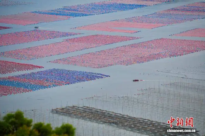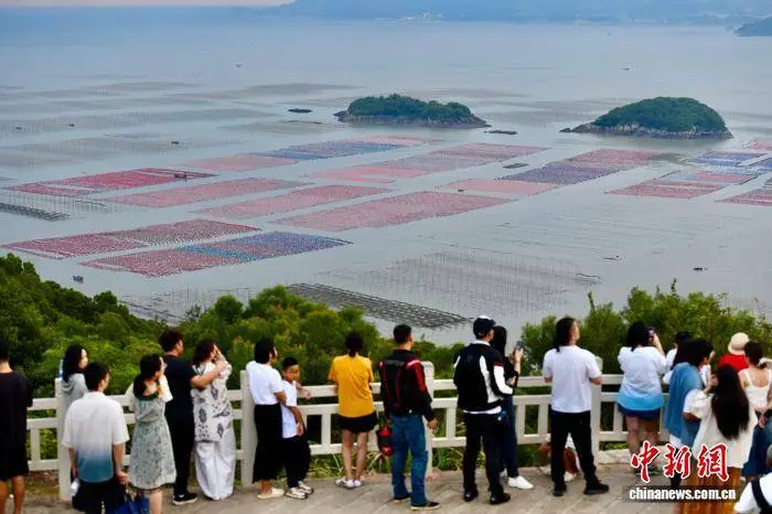 10月8日,福建霞浦出现“海上牧场”的景象,吸引众多游客前来观赏。国庆和中秋双节期间,福建省霞浦县的海滨风光十分迷人,清澈的海水、独特的滩涂、散落的渔排共同构成了一幅极其美丽的画面,不少人都被这美景所吸引而停下脚步。中新社记者 王东明 摄